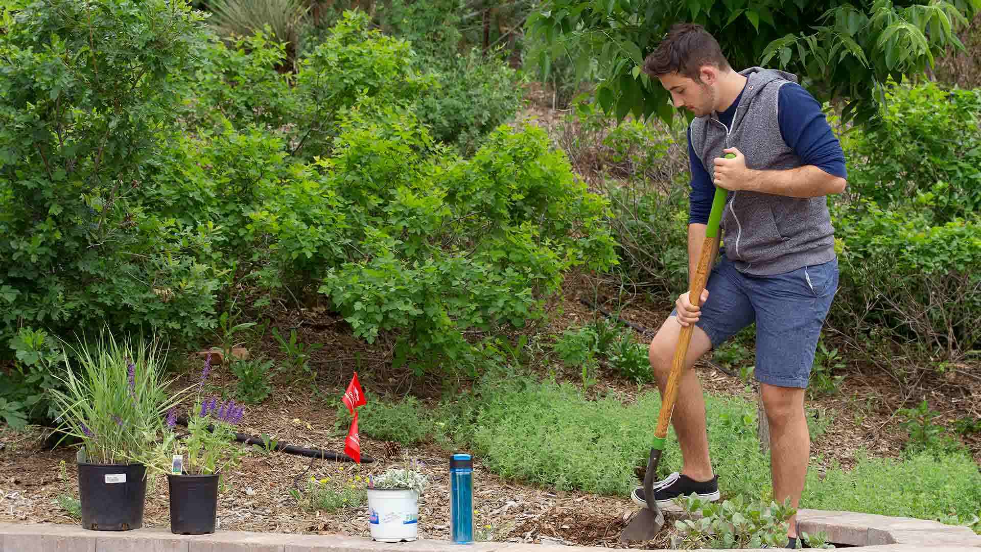 Garden spraying water over a garden bed filled with shorter plants and flowers.