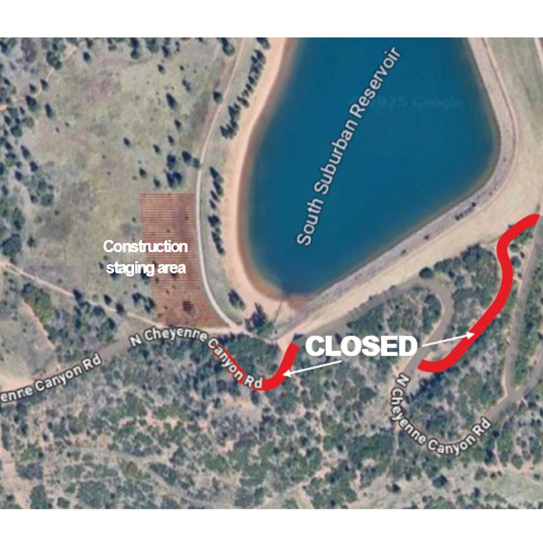 Algunos tramos de senderos cercanos al embalse están cerrados por razones de seguridad pública debido a la presencia de equipos de construcción en estas zonas (véase el mapa). Tenga cuidado con los vehículos de construcción que circulan por N. Cheyenne Canyon Road en el espacio abierto de Stratton mientras se realizan las reparaciones. Se espera que las reparaciones finalicen en noviembre de 2025.