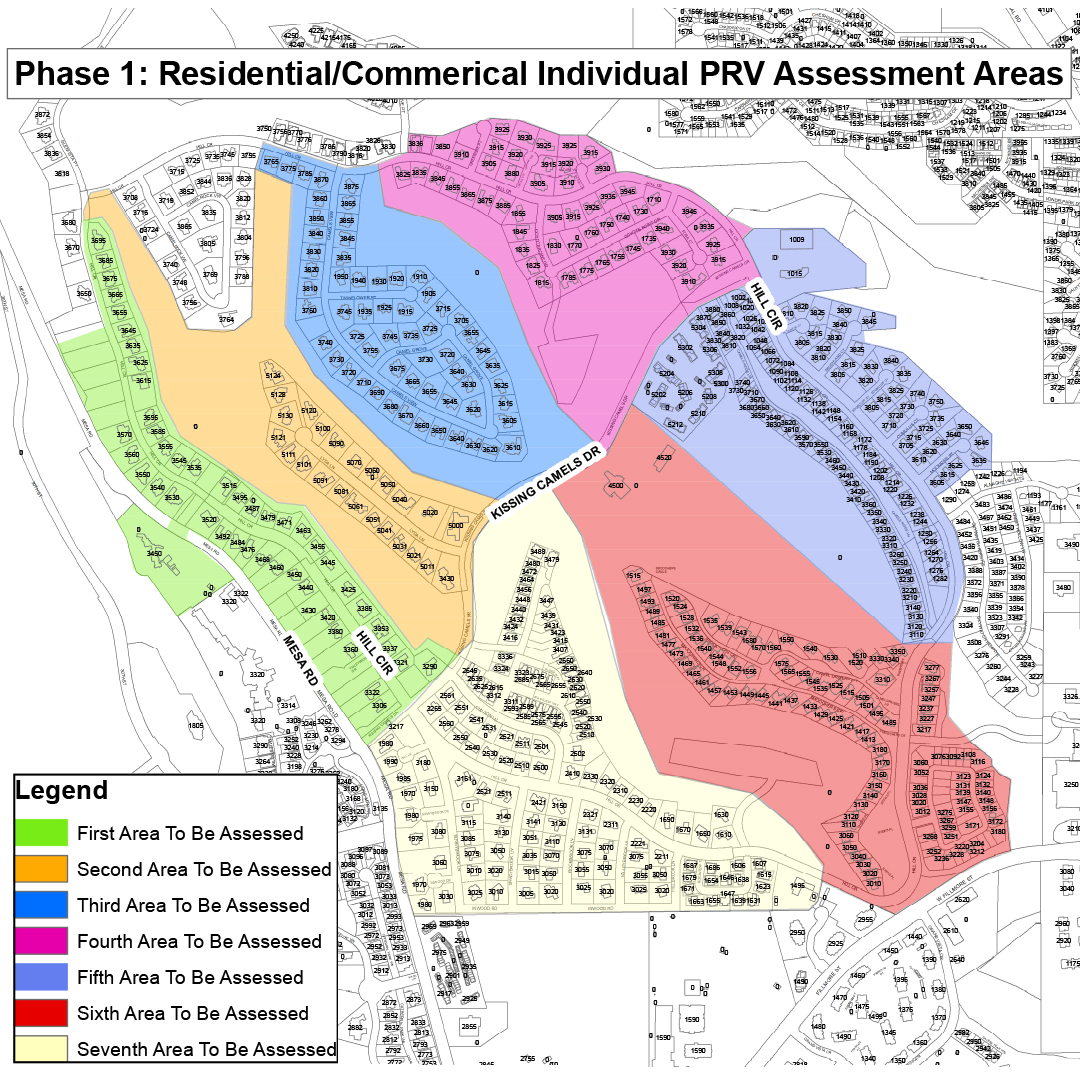 A map displaying the order in which areas will have their pressure reducing valves checked. The map shows 7 phases of the assessments starting clockwise from Mesa Road across much of the Kissing Camels neighborhood.Comenzaremos a trabajar en otoño de 2025 para mejorar la presión del agua en el lado oeste de la ciudad, cerca del parque Garden of the Gods.
